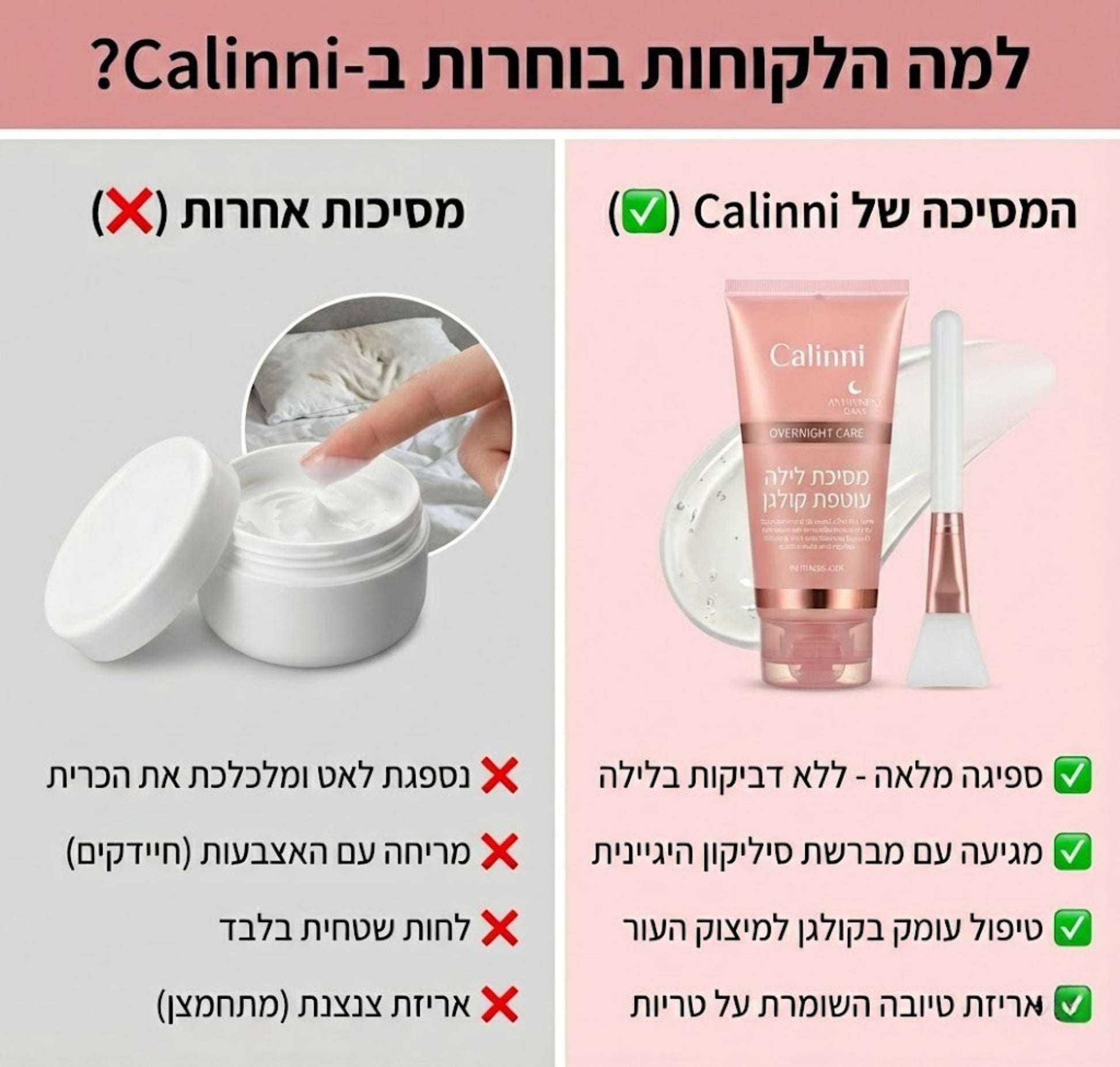 שכחי ממסכות בד רגילות שמתייבשות אחרי 20 דקות. המסכה של Calinni עשויה מקולגן ביו-אקטיבי מרוכז שנמס אל תוך העור שלך בזמן שאת ישנה.