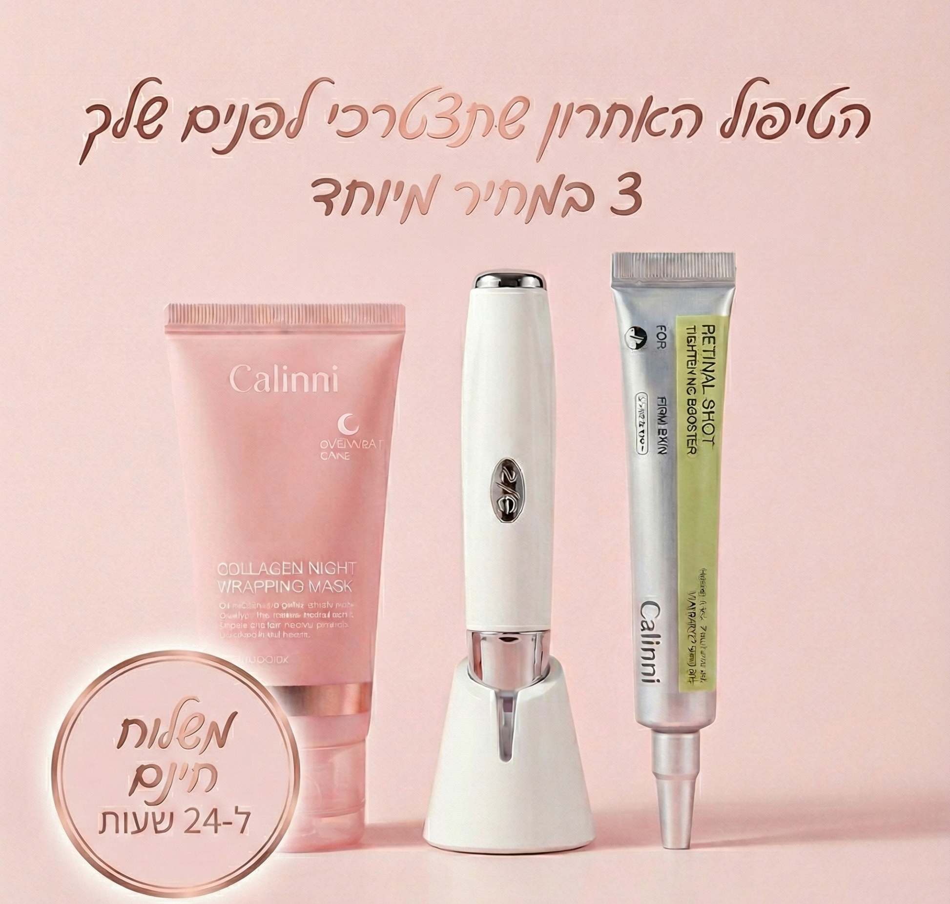 אנחנו ב-Calinni מבינים שעור הפנים שלך, ובפרט האזור העדין שסביב העיניים, לא זקוק לעוד "קרם". הוא זקוק לשיקום, הוא זקוק לעוצמה, הוא זקוק לטכנולוגיה. המארז המשולש שלנו הוא לא סתם אוסף של מוצרים; זוהי מערכת הוליסטית, מבוססת מדע, שנועדה לעבוד בסינרגיה מושלמת כדי לספק תוצאות דרמטיות שאפשר לראות ולהרגיש.